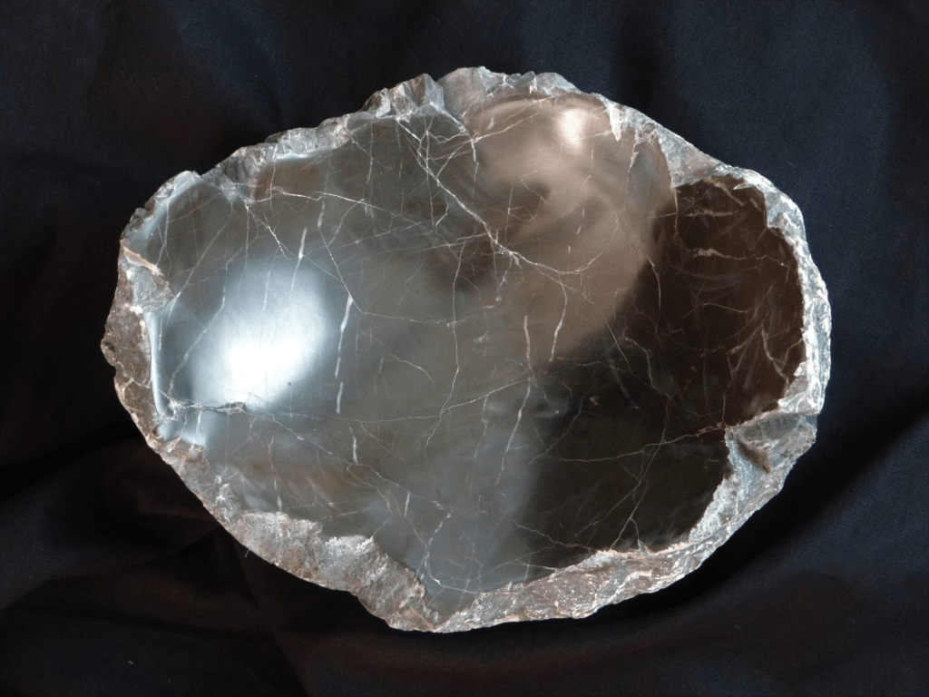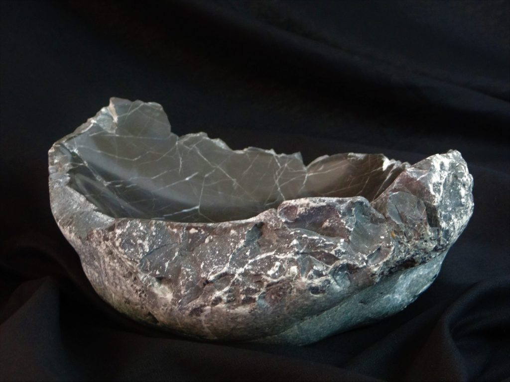 Bei dieser Schale hatte ich keinen Entwurf und auch kein Modell. Ich habe mich ganz nach dem Stein gerichtet und habe versucht, seine eigentliche Form mit einfließen zu lassen, um auch die Quarzadern gut zur Geltung zu bringen. Ich habe die Innenseite auf Hochglanz poliert und die Außenseite roh gelassen um einen möglichst hohen Kontrast zwischen dem robusten, unberührten Stein und der bearbeiteten Fläche zu erzielen.