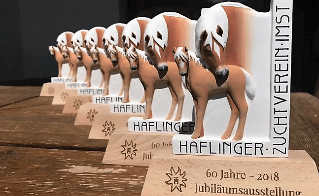 2018 durfte ich die Preise für die 60 Jahre Ausstellung des Haflinger Pferdezuchtvereins Imst machen. Dazu habe ich ein Plastelin-Modell angefertigt und eine Silikon-Negativform gemacht. So konnte ich nun problemlos 70 Stück mit einer Art Keramikgussform ausgießen. Meine gute Freundin und damalige Klassenkameradin Johanna Zangerle war für die Bemalung zuständig.